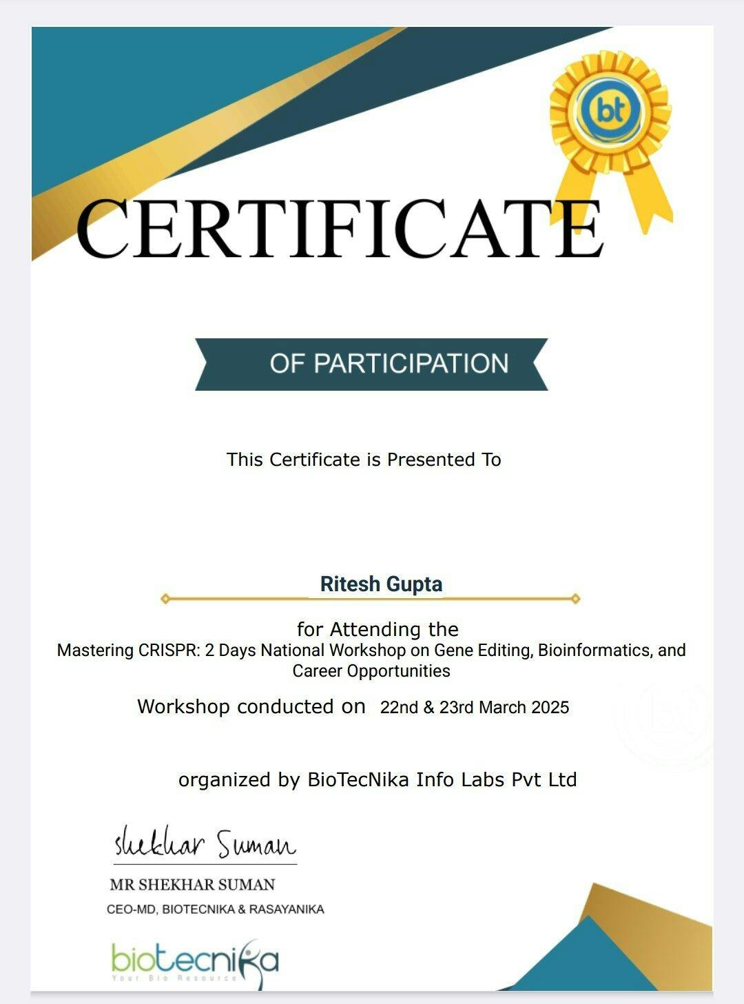 The Biotecnika workshop gave me a clear, exciting tour of CRISPR—from its discovery and mechanisms to advanced Cas variants, bioinformatics tools, delivery systems, and real-world applications. The sessions were practical, insightful, and career-focused, highlighting how rapidly this field is growing. A truly enriching experience that strengthened my understanding of gene editing and its future impact.